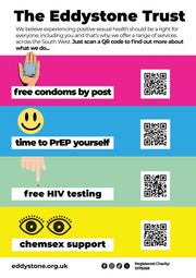 Welcome to our digital resource for professionals – this poster contains QR codes to all our main services and can be displayed in places where people may have a requirement to access this information. It can also be used on social media to promote sexual health services.